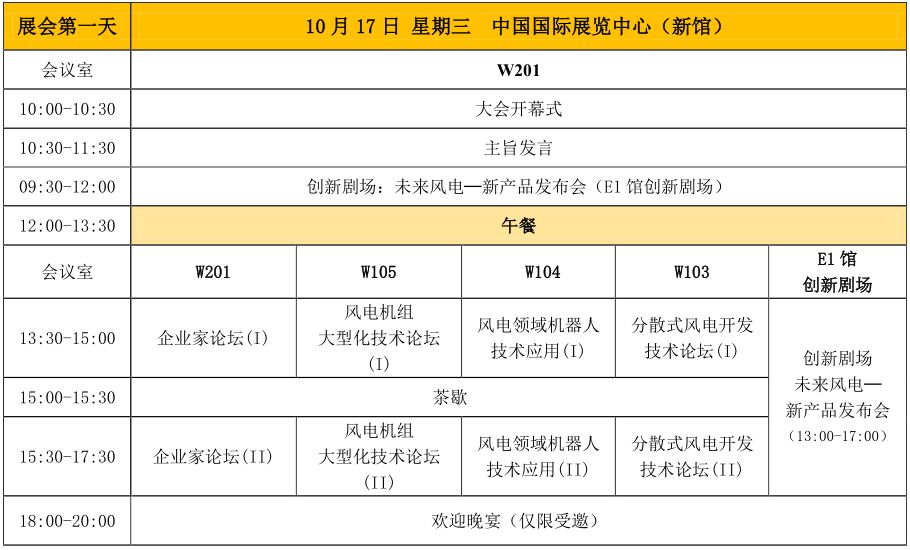 大会都已经安排上了,来看看日程概览吧!作为全球风电行业年度最大的盛会之一,2018北京国际风能大会暨展览会(CWP2018)自2008年首次在北京举办以来,已成功举办了十届。CWP2018将于10月17-19日在北京中国国际展览中心(新馆)召开。本次大会持续三天,设有主题论坛、企业家论坛、技术论坛等二十余场会议,邀请权威专家就分散式风电和海上风电等热点话题进行深入讨论和交流,精彩纷呈,不容错过。 以下为CWP2018大会日程概览。想了解更多内容,请关注大会官方网站、微信平台获取最新信息。 CWP2018开幕式回归新国展经历了两年在国家会议中心的开幕式后,今年北京国际风能大会暨展览会(CWP2018)大会开幕式将回归至中国国际展览中心(新馆)举办。 CWP2018开幕式举办信息 时间 2018年10月17日上午10点 地点 中国国际展览中心(新馆) 综合服务楼W201会议室 注册参会 普通代表全程参会的注册费用为3000元/人,您也可根据需求选择参与一天或是两天的会议。具体收费标准请登录官网查询。 全程注册参会代表享受如下待遇 参加开幕式;参加主会,分会,边会论坛;会议资料袋;参会代表卡;享用茶歇及三天午餐;参观展览;会后报告。 具体注册办法 官网注册 登录大会官网会官网www.chinawind.org.cn , 进入“会议中心-注册参会”完成注册。 敬请留意网站会议代表注册截止日期:10月10日 现场注册 10月17-19日您可至中国国际展览中心(新馆)南登录大厅“会议注册窗口”进行现场注册。 联系我们 电话:010-68485460 邮箱:xujing@chinawind.org.cn 展会综合信息